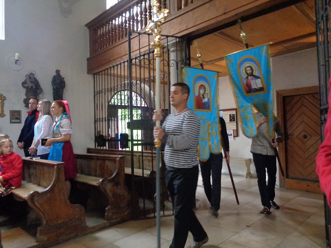 Pred sv. liturgiou sa mládež modlila modlitbu slávnostného sv. ruženca. Nasledovala procesia s krížom a zástavami v sprievode deti a mládeže do Božieho chrámu.